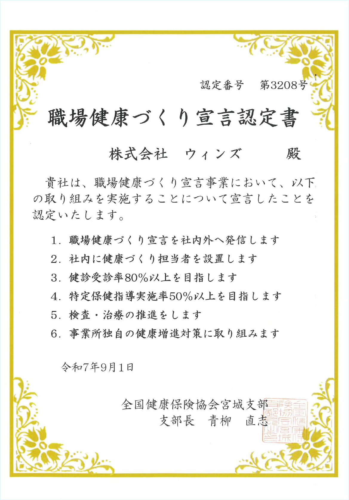 全国健康保険協会宮城支部より、当社の「職場健康づくり宣言」が認定されました。